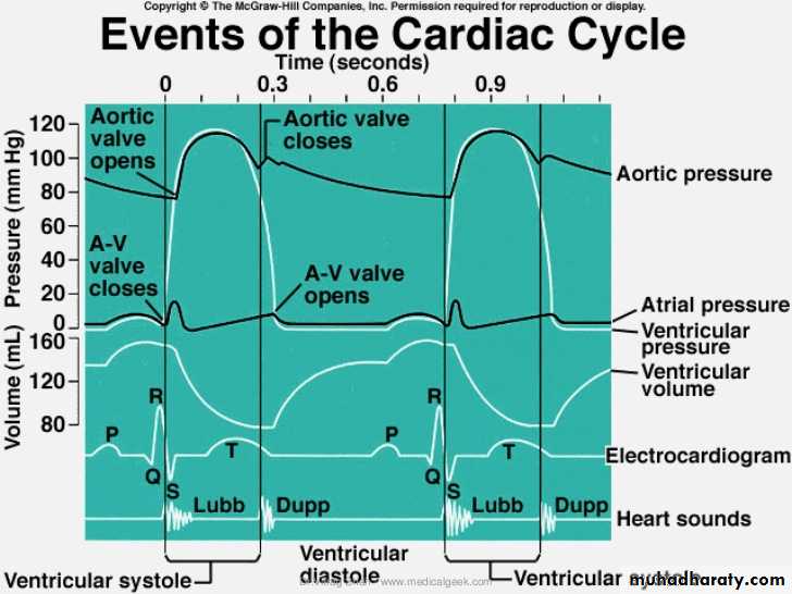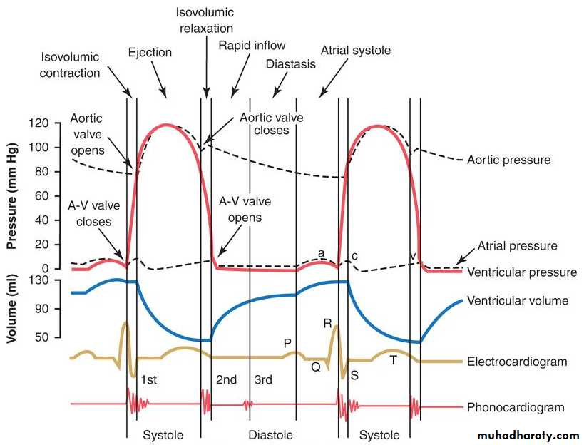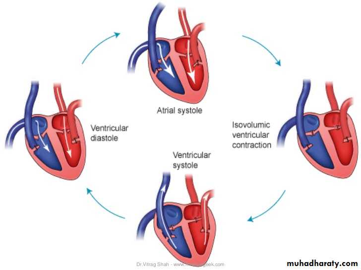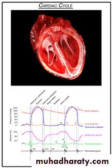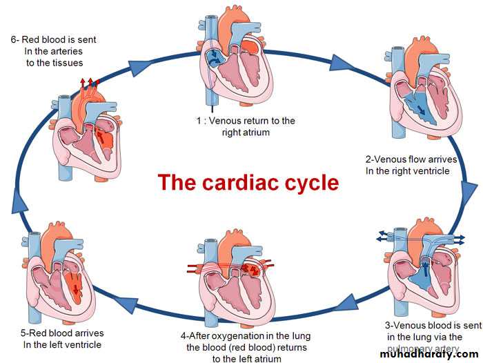 The cardiac cycle is refers to the sequence of mechanical and electrical events that repeats with every heart beat. Each cardiac cycle has two phases: diastole, the time during which cardiac muscle relaxes and ventricles fill with blood, and systole, the time during which the cardiac muscle contracts and blood ejected by ventricles.. The duration of cardiac cycle at heart rate of 75 beat/min is about 0. 8 second, 0.5 second for diastole and 0. 0.3 second for systole. The long duration of diatsole has two important physiologic and clinical implications.