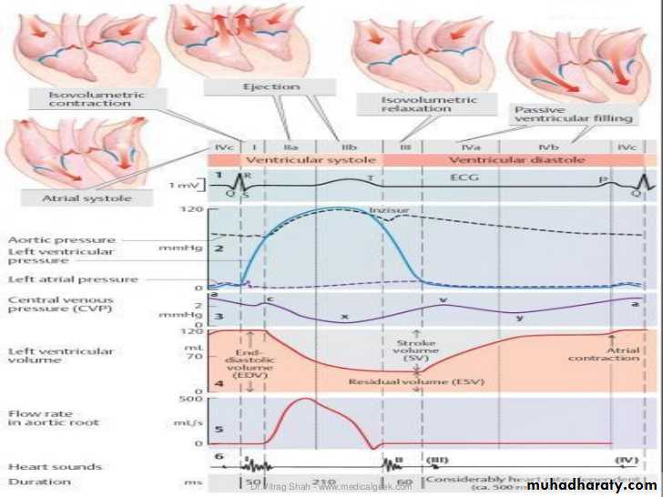 Excitation of the ventricles occurs as the wave of excitation passes through the AV node, bundle of His and Purkinje system. Ventricular contraction coinciding with the peak of the R-wave of the ECG, in response to contraction of the muscle,, the ventricular pressure rises very rapidly, the increasing intraventricular pressure lead to closure of the mitral and tricuspid valves, producing the first heart sound. the rapid rise in ventricular pressure is transmitted across the semilunar valves and appears as a small rise in the aortic pressure trace.