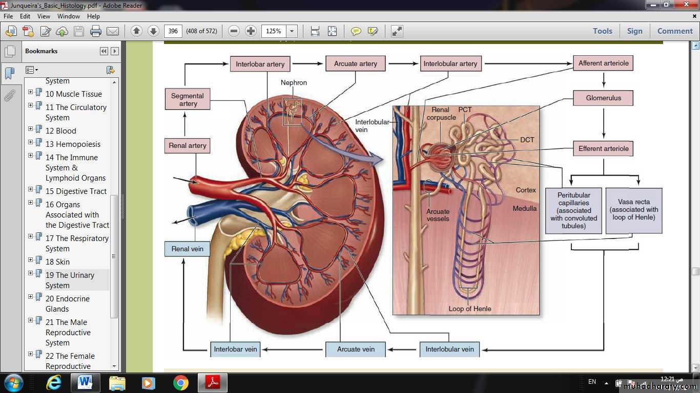 • Here the interlobar arteries divide again to form the arcuate arteries that run in an arc along this junction at the base of each renal pyramid.