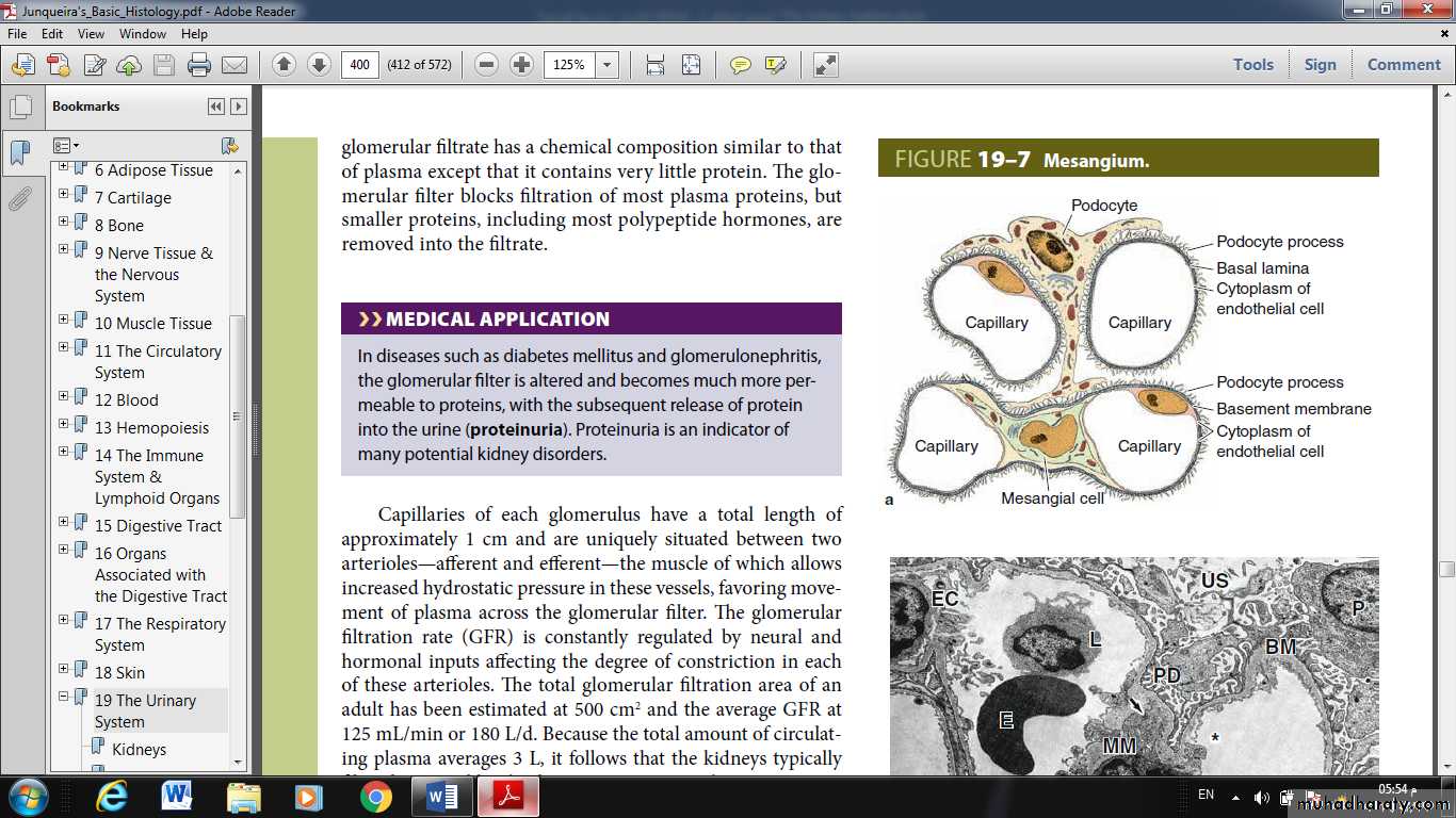 The total glomerular filtration area of an adult 500 cm2 and the average GFR 180 L/d.