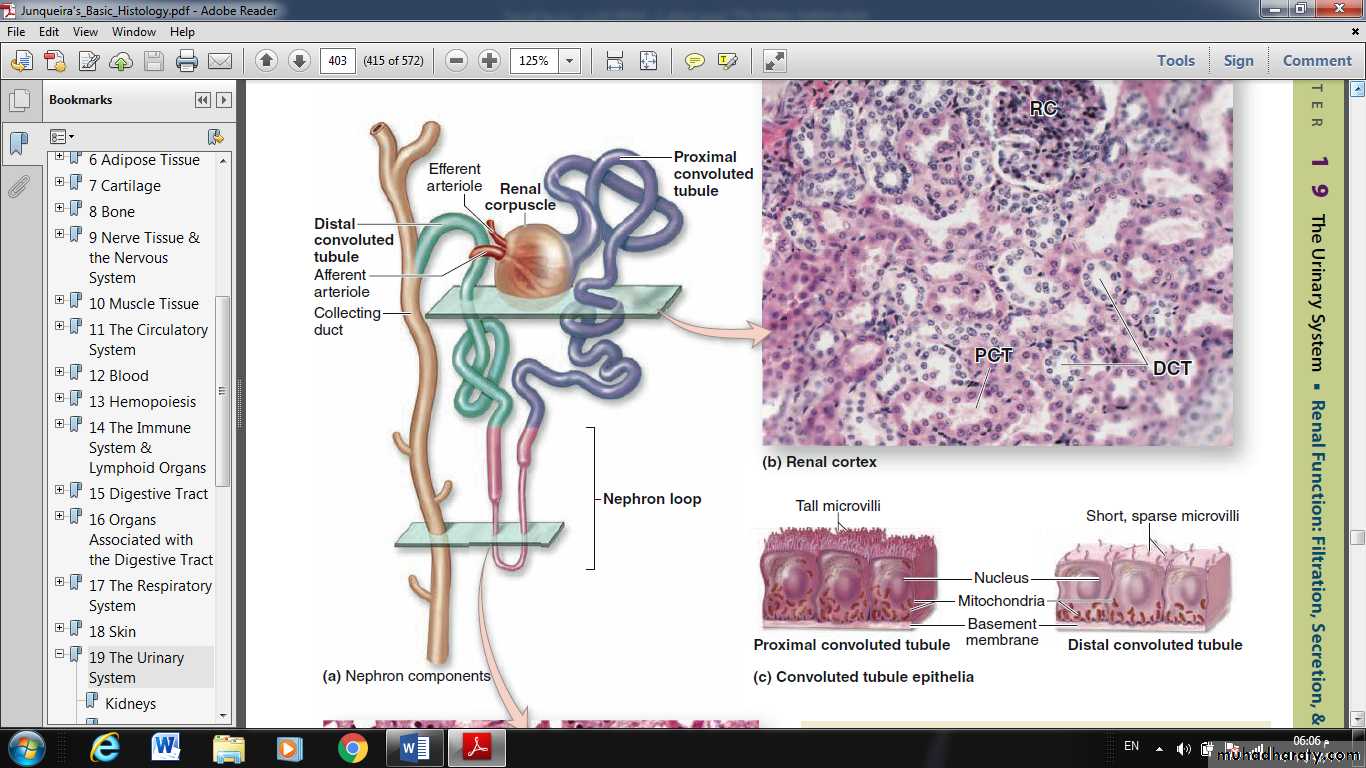 The ascending limb of the nephron is straight as it enters the cortex and forms the macula densa, and then becomes tortuous as the distal convoluted tubule (DCT).Much less tubular reabsorption occurs here than in the proximal tubule. The simple cuboidal cells of the distal tubules differ from those of the proximal tubules in being smaller and having no brush border and more empty lumens.