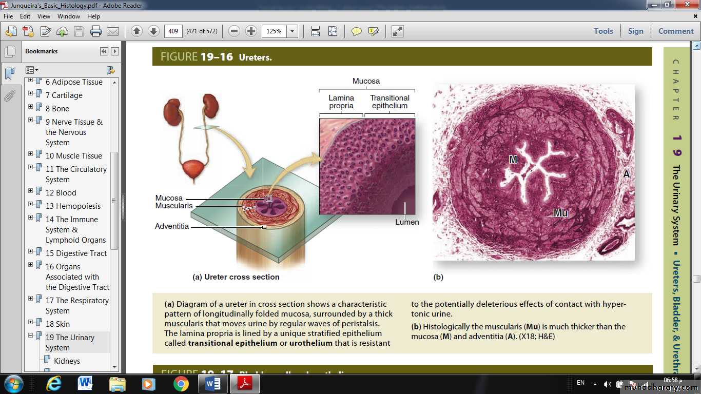 Urine is transported by the ureters from the renal pelvis to the urinary bladder where it is stored until emptying by micturition via the urethra.The walls of the ureters are similar to that of the calyces and renal pelvis, with mucosal, muscular, and adventitial layers and becoming gradually thicker closer to the bladder.