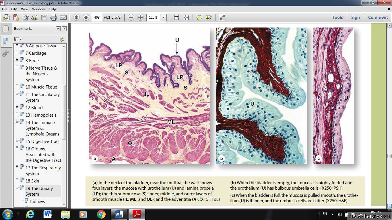 The mucosa of these organs is lined by the uniquely stratified urothelium or transitional epithelium. Cells of this epithelium are organized as three layers:
