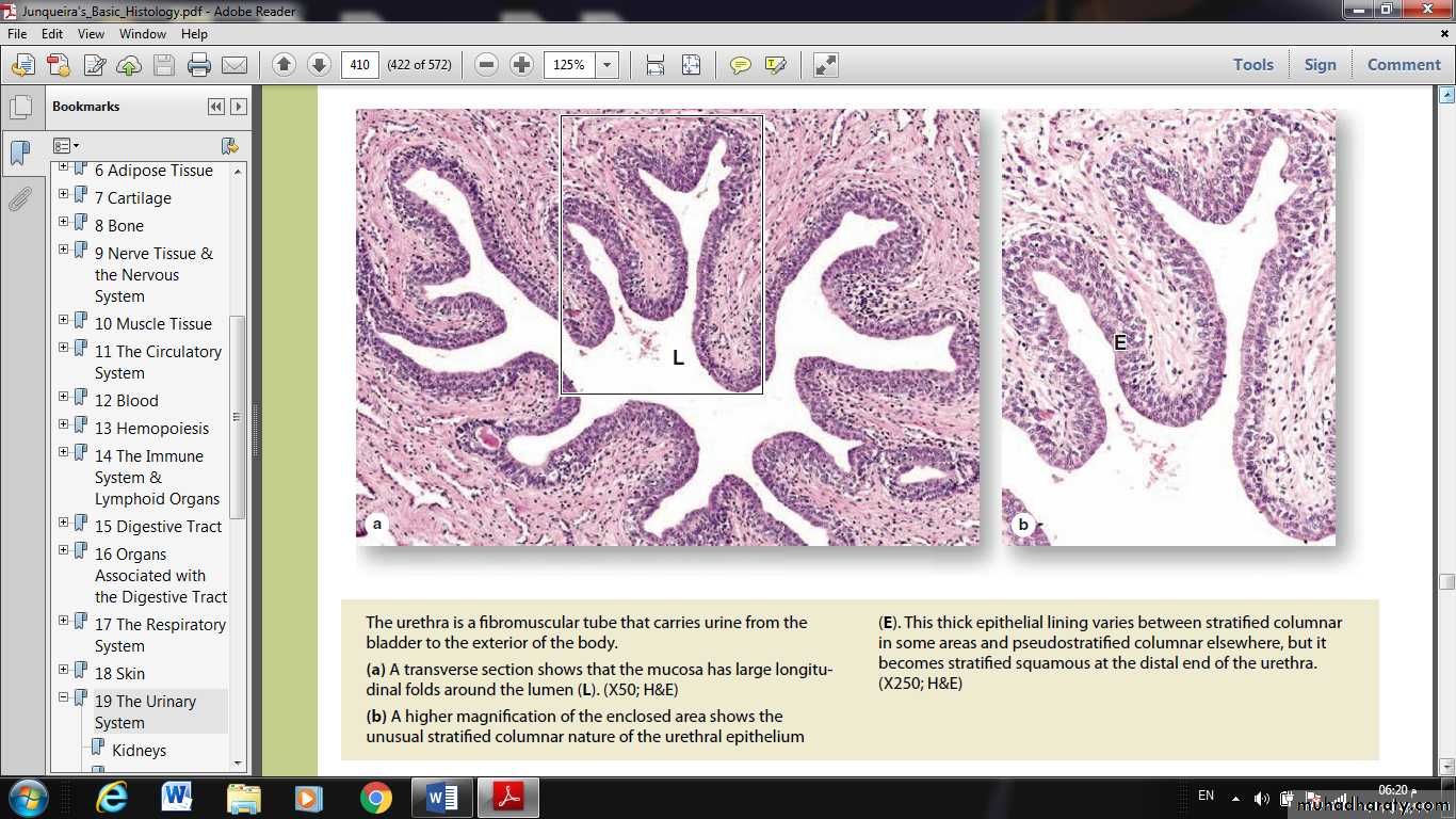 The urethral mucosa has prominent longitudinal folds, giving it a distinctive appearance in cross section.The male urethra is longer and consists of three segments: