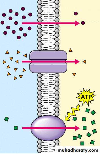 (b) Specialized transport ( carrier transport): 1. Facilitated transport The transporter, belonging to the super-family of solute carrier (SLC) transporters, operates passively without needing energy and translocates the substrate in the direction of its electrochemical gradient, i.e. from higher to lower concentration . lt mearly facilitates permeation of a poorly diffusible substrate, e.g. the entry of glucose into muscle and fat cells by GLUT 4. 2. Active transport It requires energy, is inhibited by metabolic poisons, and transports the solute against its electrochemical gradient (low to high), resulting in selective accumulation of the substance on one side of the membrane. It is saturable and follows the Michaelis-Menten kinetics. The maximal rate of transport is dependent on the density of the transporter in a particular membrane, and its rate constant (Km), i.e. the substrate concentration at which rate of transport is half maximal, is governed by its affinity for the substrate. Genetic polymorphismcan alter both the density and affinity of the transporter protein for different substrates and thus affect the pharmacokinetics of drugs. Moreover, tissue specific drug distribution can occur due to the presence of specific transporters in certain cells. (c) Pinocytosis:Large macromolecules (e.g., proteins, viruses, lipoprotein particles) require more complex mechanisms to traverse membranes, and are transported into and out of cells selectively via endocytosis and exocytosis (secretion). Interestingly, endocytosis and exocytosis are not only important for the import/export of large molecules. Often, essential small molecules that are hydrophobic or toxic (e.g., iron) travel through the bloodstream bound to proteins, which enter and exit cells via these mechanisms. Receptor-mediated endocytosis will be discussed in more detail in the Organs block.