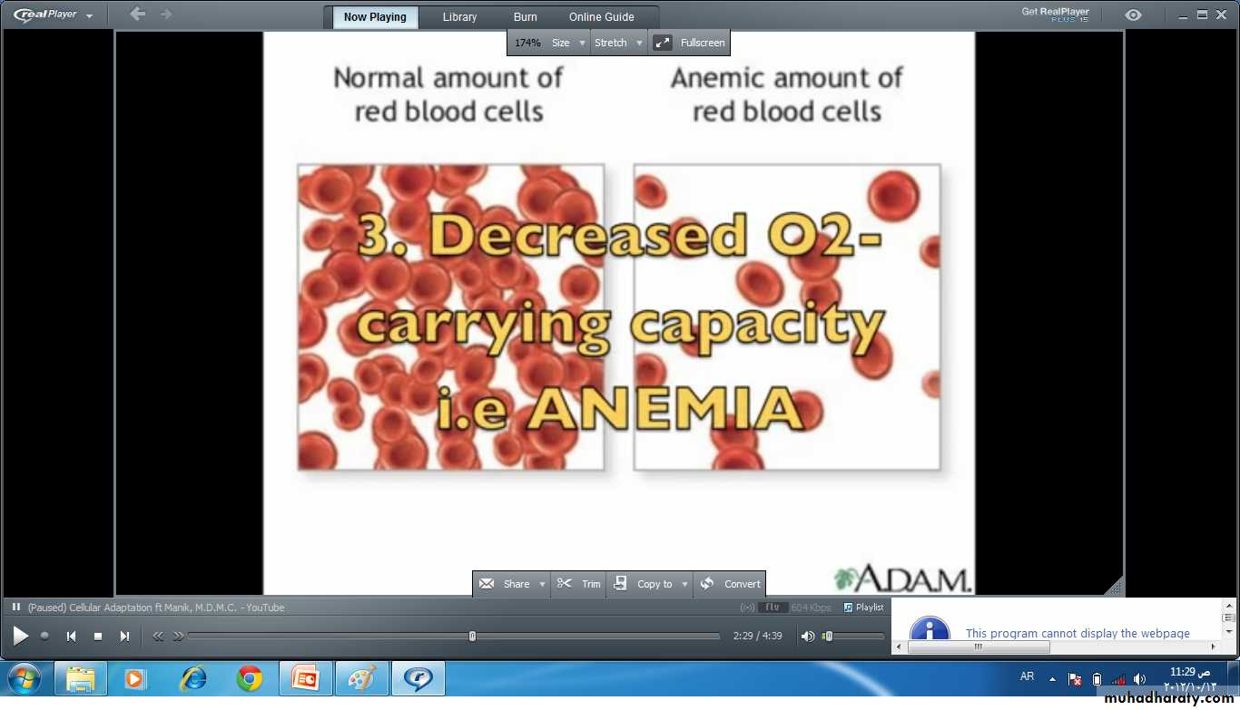 • Oxygen deprivation (hypoxia) insufficient supply of oxygen interferes with aerobic oxidative respiration and is a common cause of cell injury and death. Causes of hypoxia include