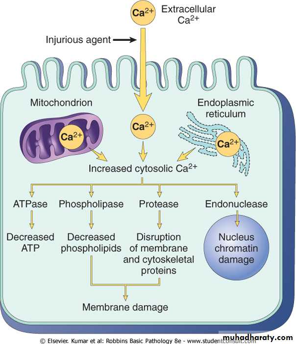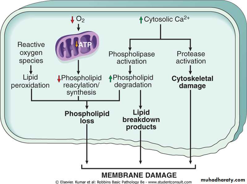 • Profound disturbances in membrane function including lysosomal membranes that result in enzymatic dissolution of the injured cells which is characteristic of necrosis.