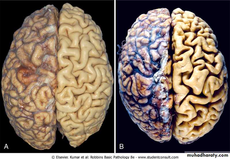 Figure 1-4 Atrophy. A, Normal brain of a young adult. B, Atrophy of the brain in an 82-year-old male with atherosclerotic disease. Atrophy of the brain is due to aging and reduced blood supply. Note that loss of brain substance narrows the gyri and widens the sulci. The meninges have been stripped from the right half of each specimen to reveal the surface of the brain.