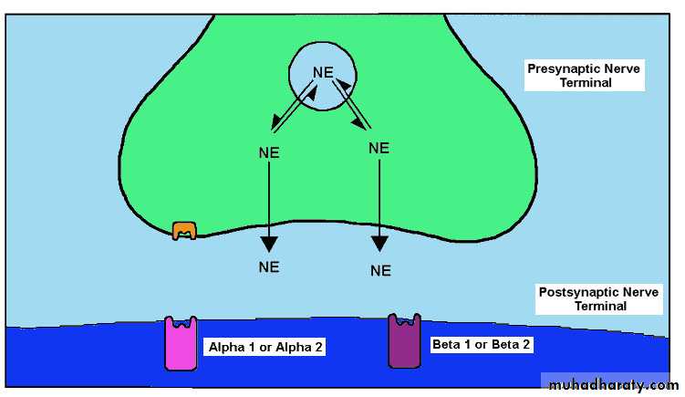 ALPHA RECEPTORS SYSTEMS:The receptor mediating the vasconstrictor actions of catecholamines is referred to as an alpha receptor.Alpha receptors have been further subdivided into alpha1 and alpha2 receptors. Both epinephrine and norepinephrine activates both the alpha1 and alpha2 receptors.Presynaptic Alpha2 ReceptorsAlpha2 receptors also exist presynaptically associated with nerve terminals. Activation of these receptors inhibits the release of norepinephrine.Norepinephrine acts at presynaptic alpha2 receptors to inhibit its own release.