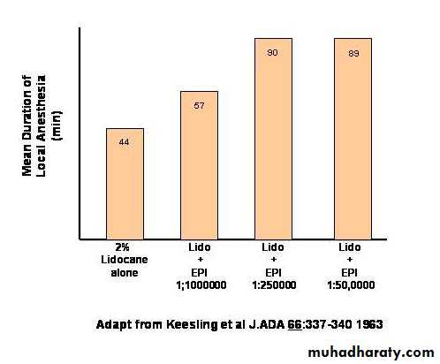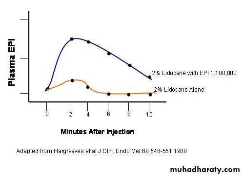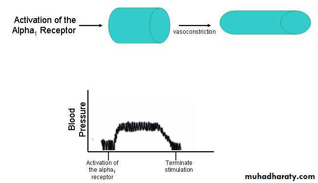 Postsynaptic Alpha1 Receptors on Vascular Smooth Muscle:Associated with vascular smooth muscle are a large number of alpha1 receptors relative to beta2 receptors. Activation of these receptors by sympathetic nervous system transmission or drugs will result in vasoconstriction and an increase in peripheral resistance and systemic arterial blood pressure.Applications to TherapeuticsOral dosing of norepinephrine or epinephrine is not possible due to the rapid metabolism of catechol nucleus in gastrointestinal mucosa and liver. Therefore, these agents are given I.V., I.M., topically and in aerosol sprays.Epinephrine is often used in combination local anesthetic agents to prolong the duration of anesthetic action. This would include articaine, bupivacaine or lidocaine. This combination is used because epinephrine can induce vasoconstriction thus limiting the diffusion of the local anesthetic from the site of injection. This not only prolongs the actions of the local anesthetic but also to reduce the toxicity of the local anesthetic by limiting its systemic absorption. Lidocaine in toxic doses can produce cardiac arrhythmias and convulsions.