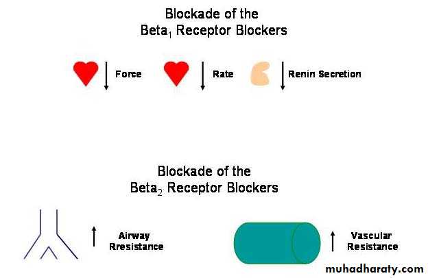 3. Propranolol is the prototype Beta Blocker as well as the prototype of a nonselective beta blocker.4. By blocking the myocardial beta1 receptor beta blockers, a) decrease the force and rate of myocardial contraction, b) Decreases renal renin secretion with the net result of c) decreasing systemic arterial blood pressure5. A major disadvantage of nonselective beta blockers is the fact that they will block beta2receptors associated with airway or vascular smooth muscle. This is a problem in treating patients with airway dysfunction or peripheral vascular disease such as alpha1 adrengericreceptor-mediated vasoconstrictor tone will be unoppsed by the beta2 receptors. To overcome this disadvantage, antagonists that selectively block the beta1 receptor have been developed.6. Atenolol is the prototype selective beta1 receptor beta blocker.Applications to DentistryBecause nonselective β-blockers block β2-receptor mediated vasodilation, there is a risk of a hypertensive episode following administration of local anesthetic agents that contain epinephrine. In this situation, the vasoconstrictor actions of epinephrine at α1 -receptors are not opposed by the vasodilatory actions of β2-receptors resulting in an exaggerated blood pressure response that could be deleterious in patients with hypertension or ischemic heart disease.Side Effects1. Sedation, fatigue2. Exacerbation of peripheral vascular disease, airway dysfunction