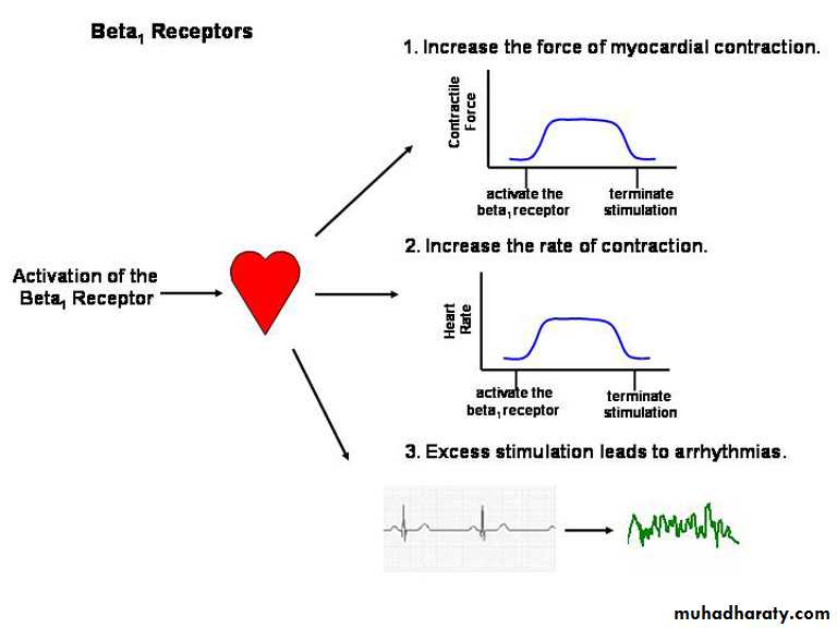 Beta Receptor SystemsMost tissues express multiple receptors. However, the dominant beta receptor in the normal heart is the beta1 receptor while the beta2 receptor is the dominant regulatory receptor in vascular and non-vascular smooth muscle. Epinephrine activates both the beta1 and beta2-receptors. Norepinephrine activates only the beta1-receptor.Effect of Beta1 Receptor Activation on the Heart: Activation of the beta1 receptor leads to increases in contractile force and heart rate. Drugs that activate the beta1 receptor can be used in heart failure to improve the contractile state of the failing heart. Drugs that activate the beta1 receptor also increase heart rate. Indeed, excess stimulation the beta1 receptor can induce significant increases in heart rate and arrhythmias. Arrhythmias are a major concern with drugs such as epinephrine that can be absorbed systemically after intra-oral injection.
