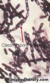 Location important in classification , Central, Sub terminal, TerminalBacillus stearothermophilus –spores Used for quality control of heat sterilization equipment ( autoclaving )