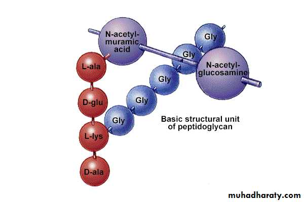 Cell WallPeptido-glycan Polymer (amino acids + sugars) , Unique to bacteria