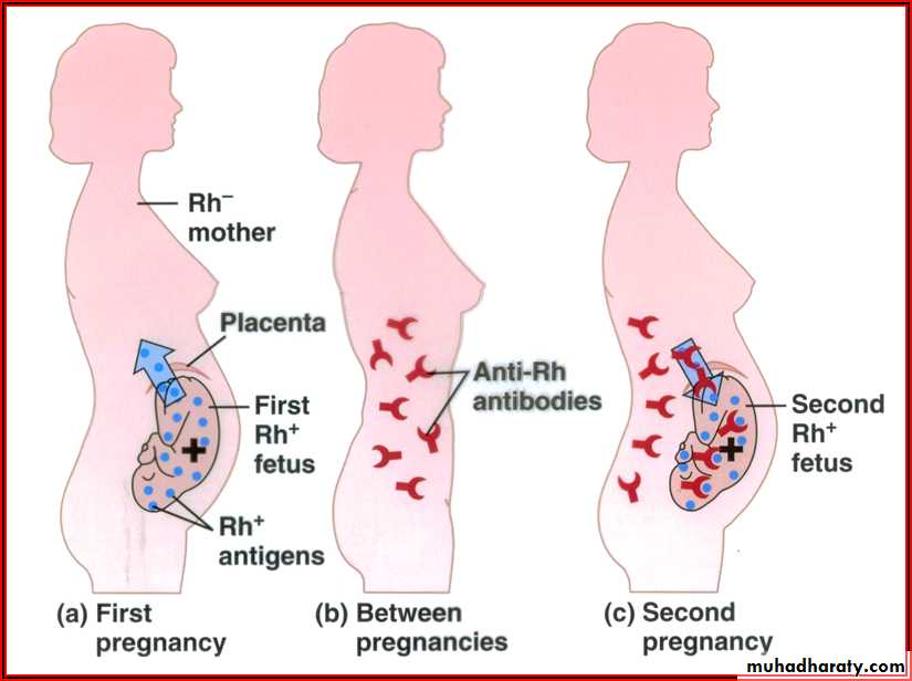 Is most common problem with "Rh incompatibility" arises when an Rh-negative mother carries an Rh-positive fetus.Small amounts of fetal blood leak into the maternal circulation at the time of delivery, and some mothers develop significant titers of anti-Rh agglutinins during the postpartum period. During the next pregnancy, the mother's agglutinins(Abs) cross the placenta to the fetus , cause hemolysis and various forms of hemolytic disease of the newborn (erythroblastosis fetalis).