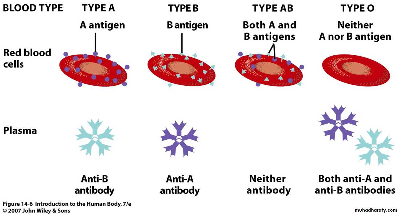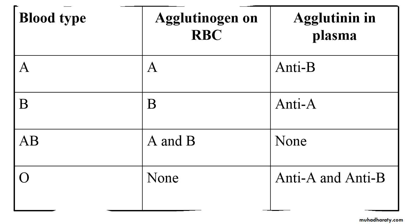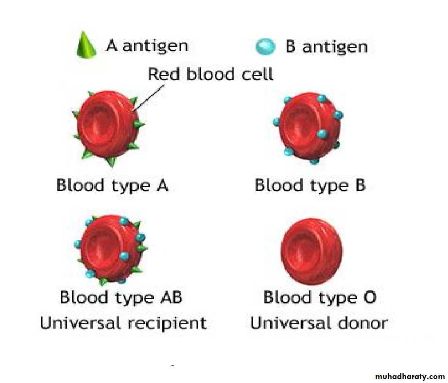ABO Blood Groups - determined by presence or absence of Type A and Type B agglutinogen proteins on the surface of RBCs cell membrane.