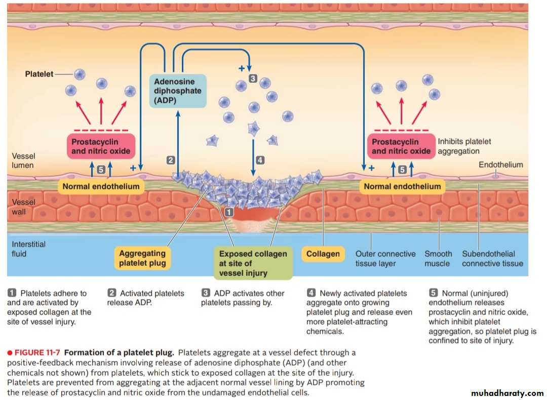 It leads to the release of more ADP , which cause more platelets to pile up at the injured site. The aggregating process is reinforced by the formation of Thromboxane A2. It directly promotes platelet aggregation and further enhances it indirectly by triggering the release of even more ADP from the platelet granules, then Formation of platelet plug takes place.