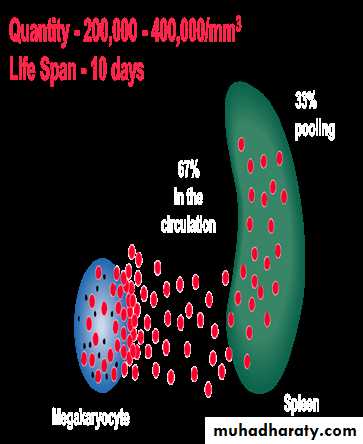 The platelets are small, granulated bodies that aggregate at sites of vascular injury. They lack nuclei and are 2-4 um in diameter . There are about( 150,000- 300,000/uL) of circulating blood, and they normally have a half-life of about 10 days.( 8-12 days).The megakaryocytes, giant cells in the bone marrow, form platelets by pinching off bits of cytoplasm and extruding them into the circulation. Between 60% and 75% of the platelets that have been extruded from the bone marrow are in the circulating blood, and the remainder are mostly in the spleen(1\3).