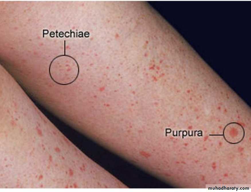 When the platelet count is low, clot retraction is deficient and there is poor constriction of ruptured vessels. The resulting clinical syndrome (thrombocytopenic purpura) is characterized by easy bruisability and multiple subcutaneous hemorrhages. Purpura may also occur when the platelet count is normal & in state of , the circulating platelets are abnormal (thrombasthenic purpura). Individuals with thrombocytosis (increased number of platelets) are predisposed to thrombotic events.