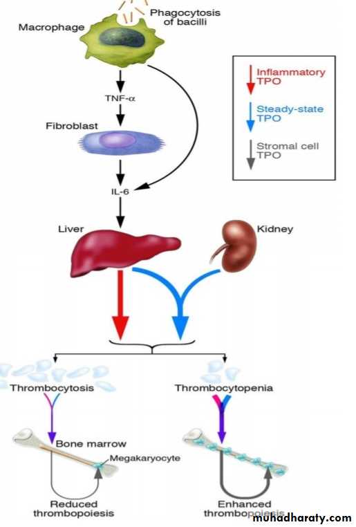 1. colony- stimulating factors that control the production of megakaryocytes.2. Thrombopoietin, a circulating protein