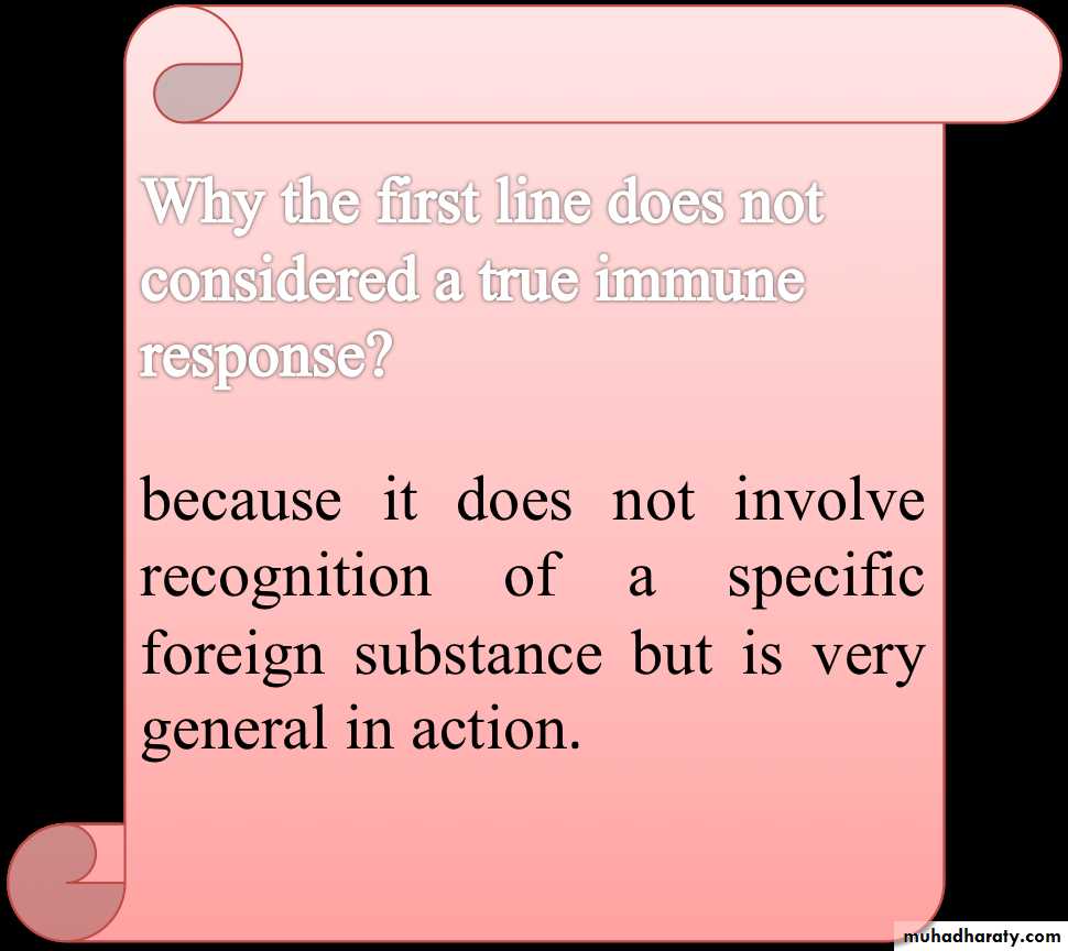 Innate (non-specific) immune response: which is the first line of defense against infection and it does not alter on repeated exposure to a given infectious agent and it react in the same manner with each pathogen.