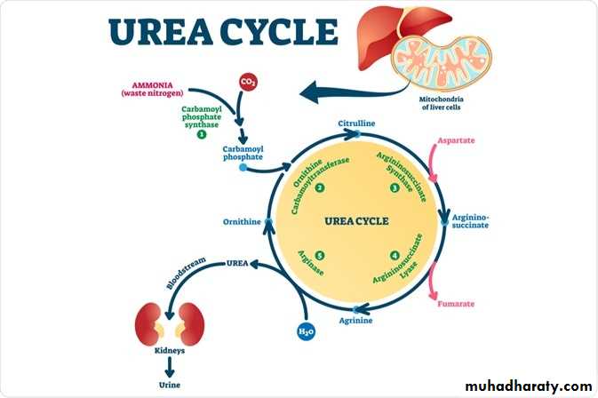 • •Urea diffuses from the liver and is transported in the blood to the kidneys, where it is filtered and excreted in the urine .• •A portion of the urea diffuses from the blood into the intestine and is cleaved to CO2 and ammonia by bacterial urease. The ammonia is partly lost in the feces and partly reabsorbed into the blood.