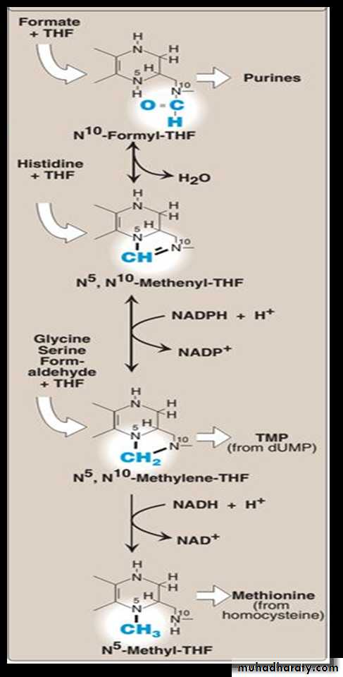 Folic acid: a carrier of one-carbon unitsThe active form of folic acid, tetrahydrofolic acid (THF), is produced from folate by dihydrofolate reductase in a two-step reaction requiring two moles of NADPH. The carbon unit carried by THF is bound to nitrogen N5 or N10, or to both N5 and N10. THF allows one-carbon compounds to be recognized and manipulated by biosynthetic enzymes.