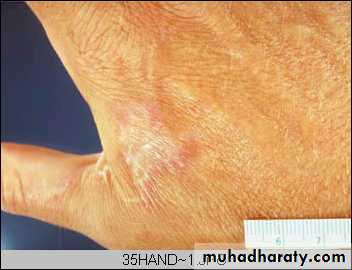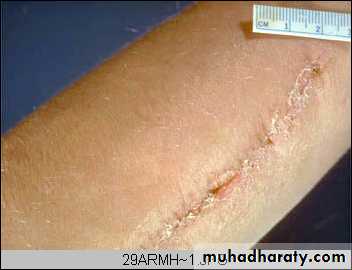 Arm, healing surgical incision. This image demonstrates healing by first intention which occur in clean, un infected wounds that have apposed edges.