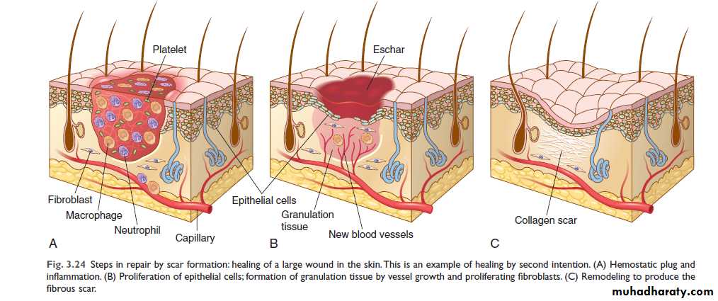 inflammatory ulceration, abscess formation, and surface wounds that create large defects, the reparative process is more complicated. The common denominator in all these situations is a large tissue defect that must be filled. Regeneration of parenchymal cells cannot completely reconstitute the original architecture. Abundant granulation tissue grows in from the margin to complete the repair. This form of healing is referred to as “secondary union” or “healing by second intention.”