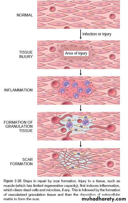 Repair (healing by scaring), the replacement of lost tissue by granulation tissue which matures to form scar tissue.