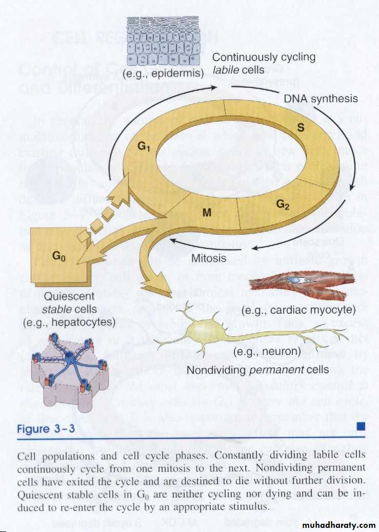 Constantly dividing labile cells continuously cycling from one mitosis to the next. Nondividing permanent cells have exited the cycle and are distended to die without further division. Quiescent stable cells in G0 are neither cycling nor dying and can be induced to re-enter the cycle by an appropriative stimulus.