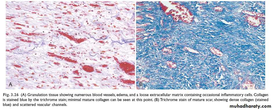 This is characterized by proliferation of fibroblasts and an in growth of new blood vessels into the area of injury, with a variable number of inflammatory cells.Fibroblasts actively synthesize and secrete extra-cellular matrix components, including fibronectin, proteoglycans, and collagen types I and III. The fibronectin and proteoglycans form the ‘scaffolding’ for rebuilding of the matrix. Fibronectin binds to fibrin and acts as a chemotactic factor for the recruitment of more fibroblasts and macrophages.