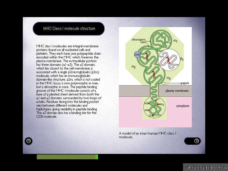 The alpha 3 domain is structurally homologous to Ig-constant domains, and contains a site which interacts with CD8 on cytotoxic T-cells.B2MG is non-polymorphic in humans. This molecule also associates with a number of other class I like molecule, for example the products of the CD1-genes on chromosome 1 in man, and the Fc-R that mediates the uptake of IgG from milk in intestinal cells of neonate.