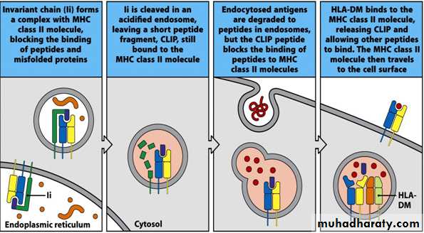 In the ER – a region of Ii interacts with the binding groove to prevent binding of endogenous peptidesLi also acts as “chaperone” to allow the MHC class II molecule + Ii to leave the ER