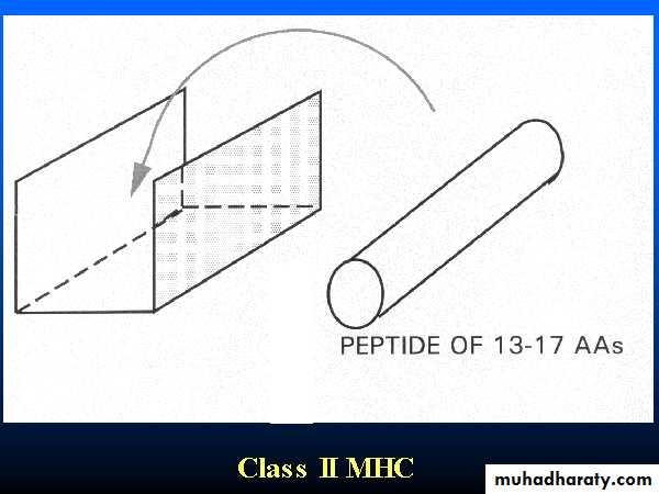 The class II groove is more open than that of class I, so that longer peptides can be accommodated. As the class II groove is not closed at the ends, peptides bound to MHC II molecule extend out of the ends of the groove.Peptides bind to MHC II come from proteins which have been internalized by the cell and then degraded. These peptides are less uniform in size and may be trimmed once they have bound to the MHCII-molecule.