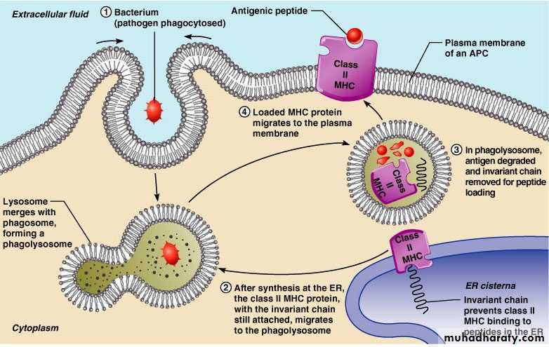 Class II MHC proteins migrate into the phagosomes where the antigen is degraded and the invariant chain is removed for peptide loading
