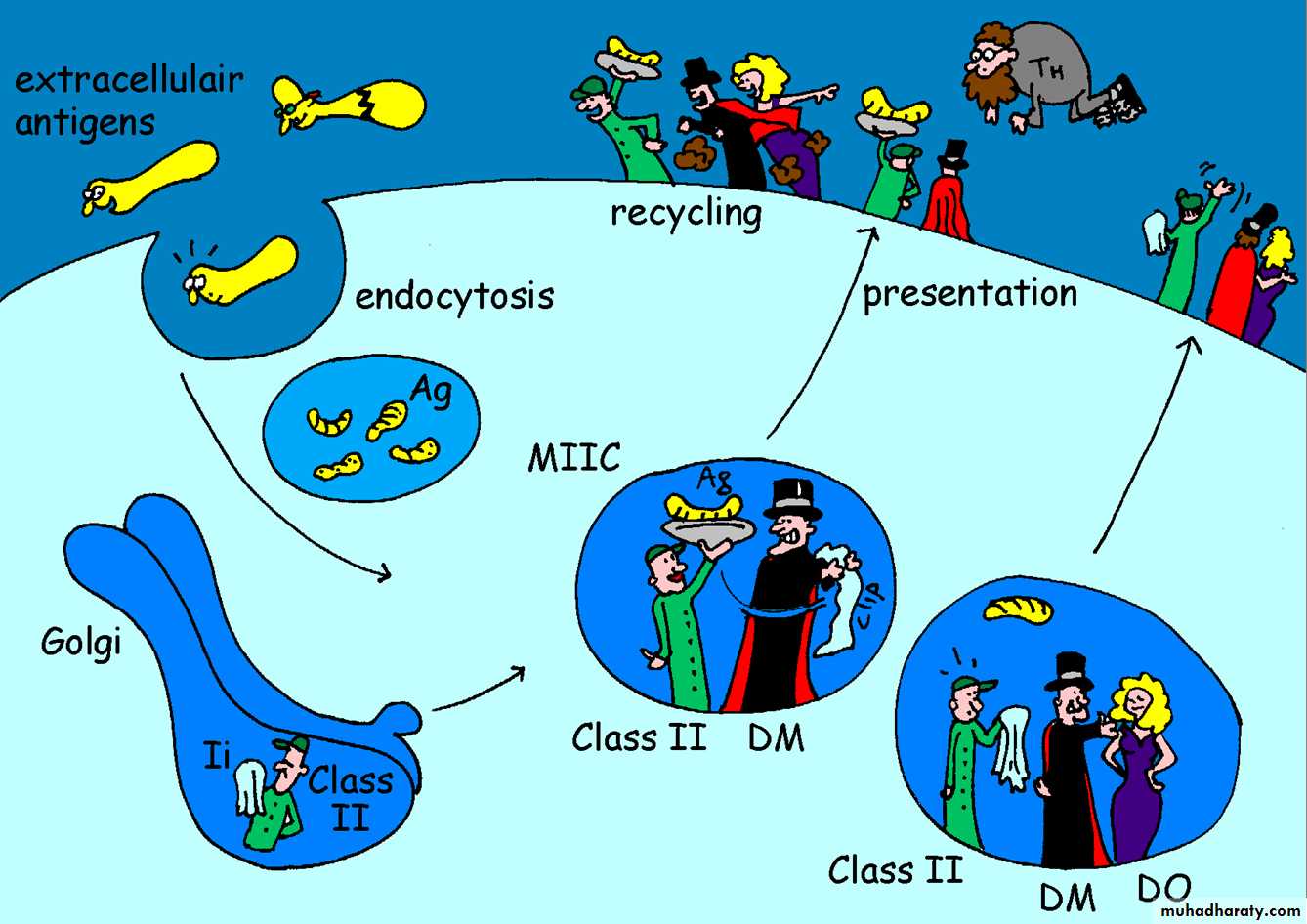 Loaded Class II MHC molecules then migrate to the cell membrane and display antigenic peptide for recognition by CD4 cells