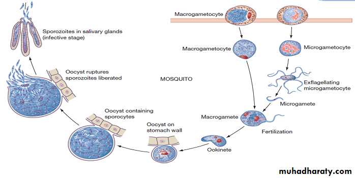 When a female Anopheles mosquito vector bites an infected person, it sucks blood containing the different stages of malaria parasite. All stages other than gametocytes are digested in the stomach. The microgametocyte undergoes ex-flagellation. The nucleus divides by reduction division into 6-8 pieces, which migrate to the periphery. At the same, time 6-8 thin filaments of cytoplasm are thrust out, in each passes a piece of chromatin. These filaments, the microgametes, are actively motile and separate from the gametocyte. The macrogametocyte by reduction division becomes a macrogamete. Fertilization occurs by entry of a micro gamete into the macro gamete forming a zygote. The zygote changes into a worm like form, the ookinete, which penetrates the wall of the stomach to develop into a spherical oocyst between the epithelium and basement membrane. The oocystes increase in size. Thousands of sporozoites develop inside the oocysts. Oocysts rupture and sporozoites are liberated in the body cavity and migrate everywhere particularly to the salivary glands. Now the mosquito is infective. The sporogonous cycle in the mosquito takes 8-12 days depending on temperature .Recurrence of malaria :