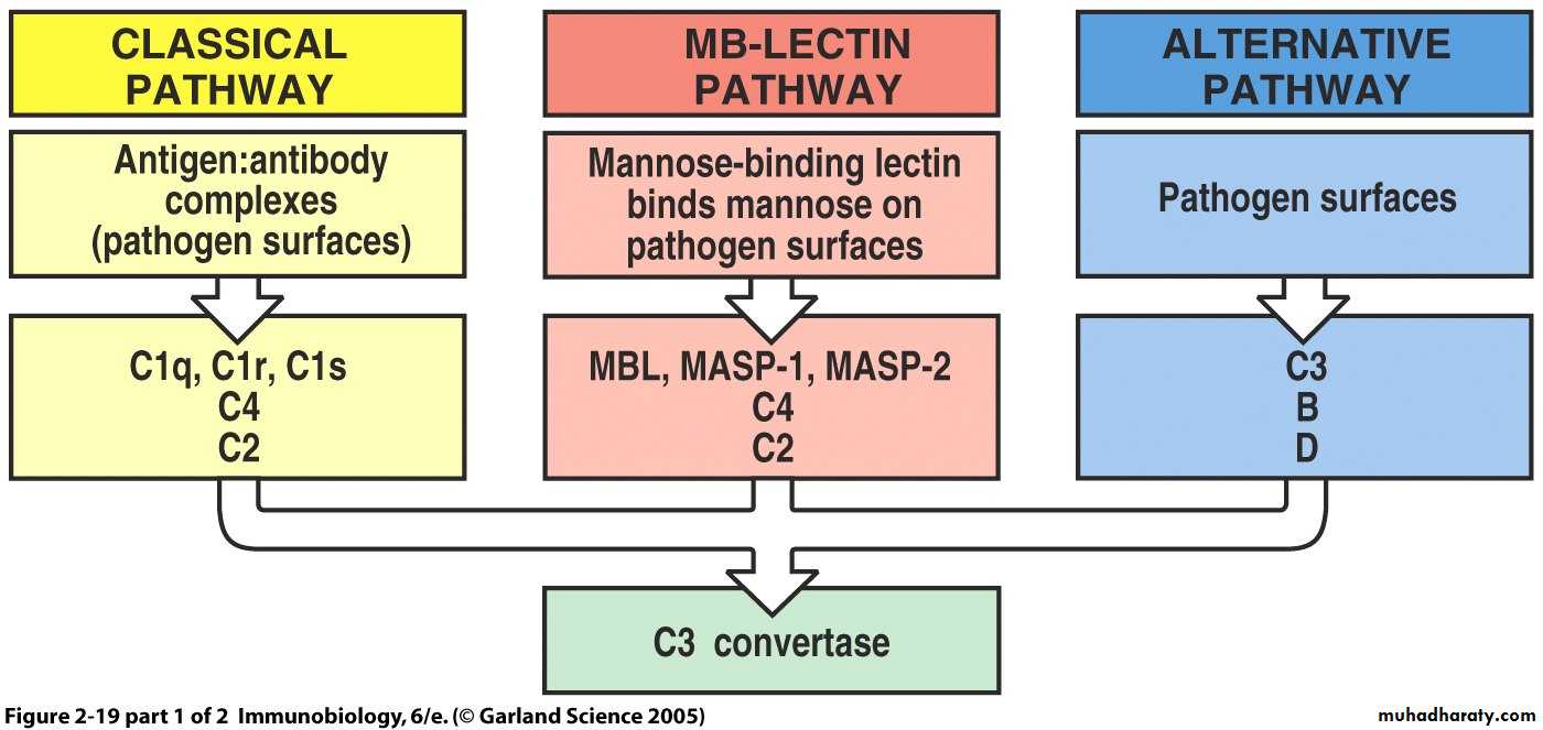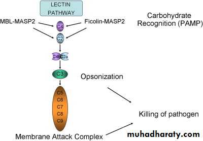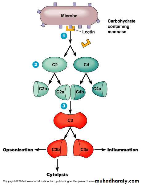 Mannose-binding Lectin PathwayThis pathway is activated by the binding of mannose-binding lectin (MBL) to mannose residues on the pathogen surface. This in turn activates the MBL-associated serine proteases, MASP-1 and MASP-2, which activate C4 and C2, to form the C3 convertase, C4b2a.