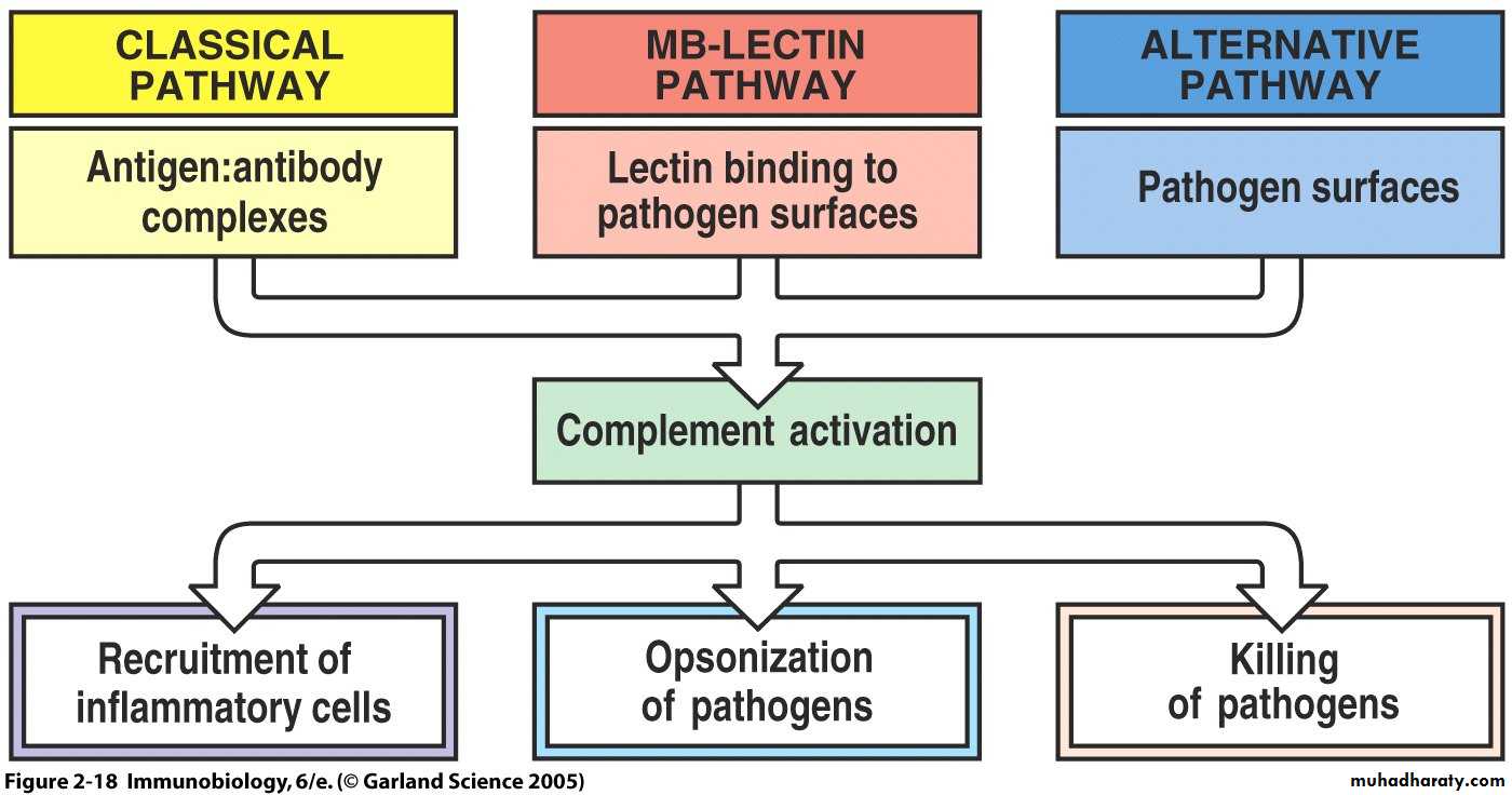 was discovered by Jules Bordet as a heat-labile component of normal plasma that causes the opsonisation and killing of bacteria. The complement system refers to a series of >30 proteins, circulating in the blood and tissue fluids. Most of the proteins are normally inactive, but in response to the recognition of molecular components of microorganisms they become sequentially activated in an enzyme cascade – the activation of one protein enzymatically cleaves and activates the next protein in the cascade.Complement can be activated via three different pathways (Figure 1), which can each cause the activation of C3, cleaving it into a large fragment, C3b, that acts as an opsonin, and a small fragment C3a (anaphylatoxin) that promotes inflammation. Activated C3 can trigger the lytic pathway, which can damage the plasma membranes of cells and some bacteria. C5a, produced by this process, attracts macrophages and neutrophils and also activates mast cells.