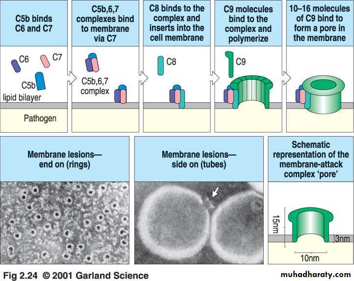 C5b6789 bound to cells insert themselves into the cell membrane and produce transmembrane channels allowing ions to pass throughThe osmotic equilibrium of the cell is disturbed with rapid influx of water into the cell which swells and lyses