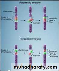 This abnormality result from 2 breaks in the chromosome and the piece between the two breaks will rotate 180 degree and is fixed back again in its rotated position.The breaks may involve either the short arm or the long arm and the inversion is called paracentric (the breaks are on one side of the centromere), or pericentric (the breaks may involve both arms and the centromere is involved in the inversion, which id more sever.)
