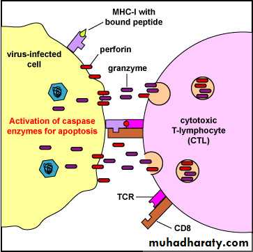Cytotoxic T-lymphocyte (CTL)-Induced Apoptosis of a virus-Infected Cell. Binding of the CTL to the infected cell triggers the CTL to release pore-forming proteins called perforins, proteolytic enzymes called granzymes, and chemokines. Granzymes pass through the pores and activate the caspase enzymes that lead to apoptosis of the infected cell by means of destruction of its structural cytoskeleton proteins and by chromosomal degradation. As a result, the cell breaks into fragments that are subsequently removed by phagocytes.