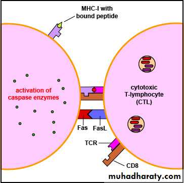These include Fas (CD95) and the type-1 TNF-R (TNFR-1) which are widely distributed in the body.CD8+ T cell can kill the infected cells is via Fas/Fas L interactions. Activated CD8+ T cells express Fas L on the cell surface, which binds to its receptor, Fas, on the surface of the target cell.