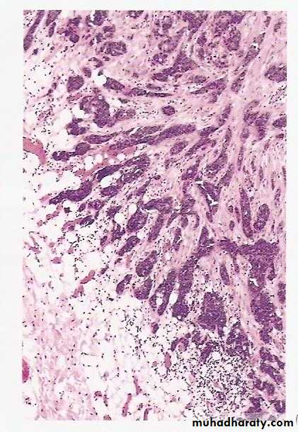 Malignant tumors are invasive (infiltrative), they invade and destroy normal surrounding tissues. They usually lack a well-defined capsule or line of cleavage, thus, their enucleation is impossible, and their surgical removal requires removal of a considerable margin of healthy apparently uninvolved tissue.