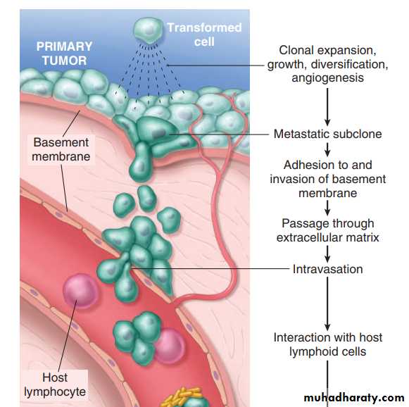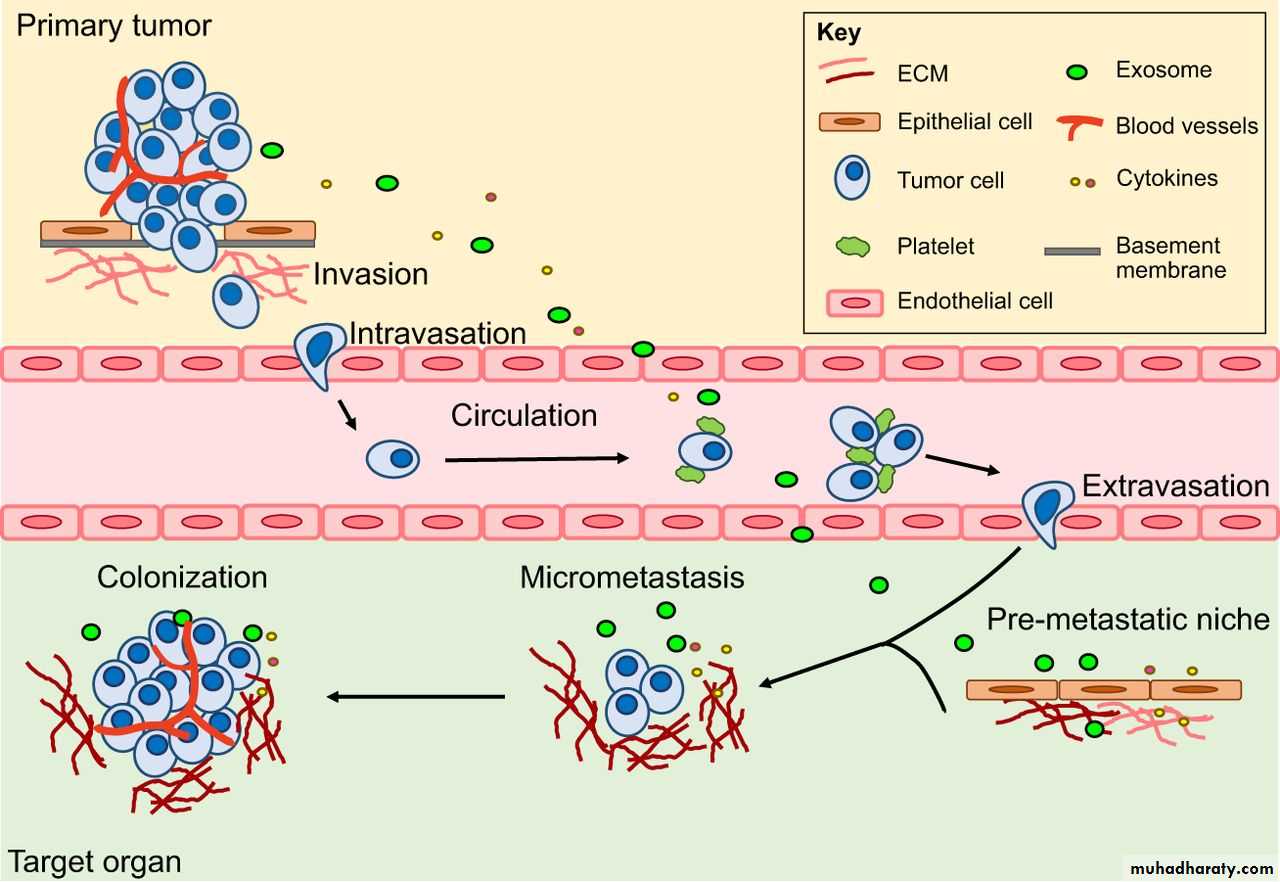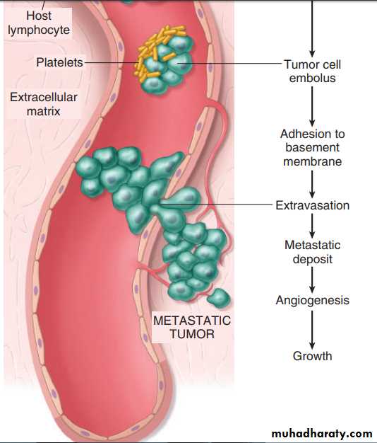 vascular dissemination and homing of tumor cells once in the circulation tumor cells are vulnerable to destruction by the host immune cells, in the blood stream, some tumor cells form emboli by aggregating and adhering to circulating leukocytes, particularly platelets, aggregated tumor cells are afforded some protection from the antitumor host effecter cells, extravasation of free tumor cells or tumor emboli involves adhesion to the vascular endothelium followed by egress through the BM by mechanism similar to these involved in invasion.