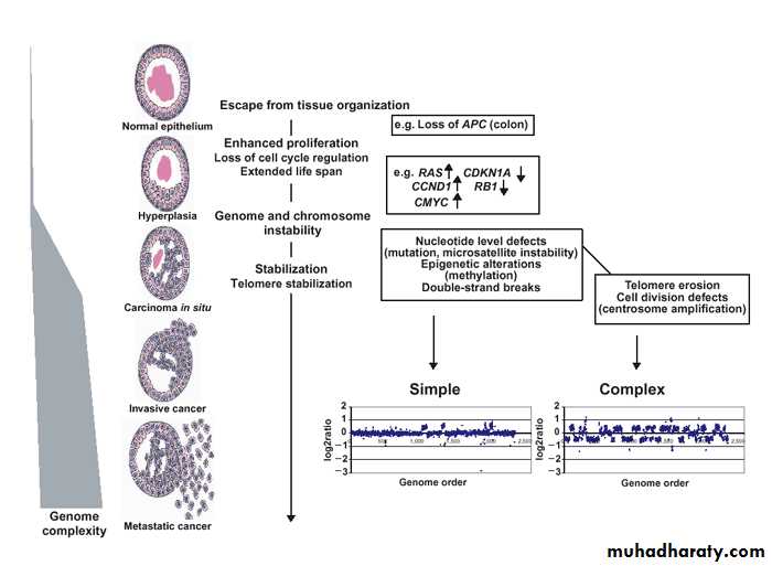 • at the genetic (molecular) level, these features are due to accumulation of genetic lesions that are favored or facilitated by defects in the DNA repair.