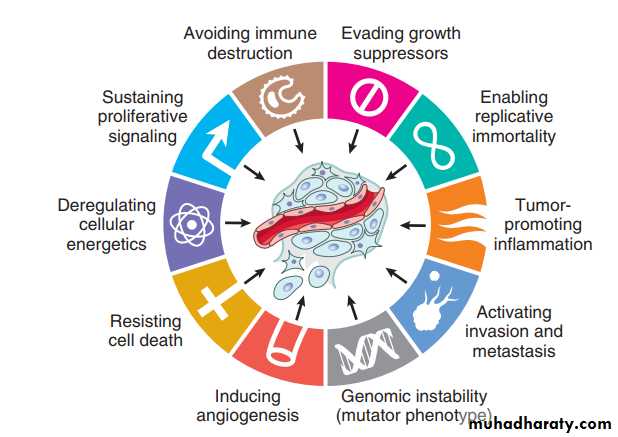• it appears that all cancers display eight fundamental changes in cell physiology, which are considered the hallmarks of cancer. these changes are consist of the following:• • self-sufficiency in growth signals