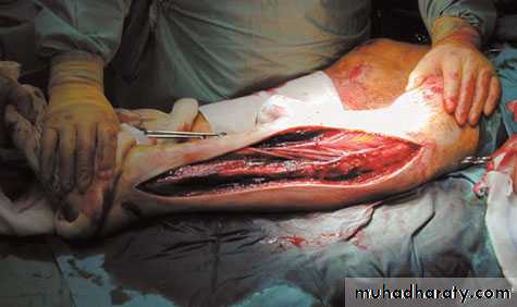 The primary cause must be removed if possible e.g. removal of tight POP cast, bandages or dressings. Control of main vessel insufficiency, and measure the pressure. If it’s present and there is no relief THE CLOSED COMPARTMENT MUST BE OPENED by surgical FASCIOTOMY by opening of the tight deep fasciae all over the closed compartment to decrease the local pressure and break the circle of progressive tissue death and improve capillary circulation.Fascitomy is an urgent simple surgical procedure that can save a limb from serious consequences as deformity and functional losses.