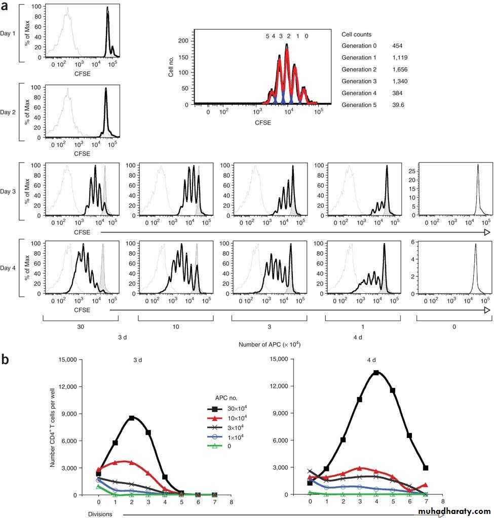 • Counting cells via flow cytometry• T‐cell functional assays: antigen, aCD3, or mitogen‐induced proliferation (CFSE preferred these days, formerly 3H thymidine incorporation Into DNA)